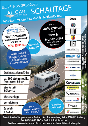 Um die Wohnmobilisten beim sicheren Start in den Sommerurlaub zu unterstützen, bietet AL-CAR an beiden Tagen von 10:00 bis 12:00 Uhr eine Wohnmobil-Wiegeaktion „Sicher in den Sommer-Urlaub“ in Zusammenarbeit mit der GTÜ Kfz-Prüfstelle Ratzeburg an. Diese hat ihren Standort gegenüber von der AL-CAR, ebenfalls an der Tongrube im Gewerbegebiet Neu-Vorwerk.