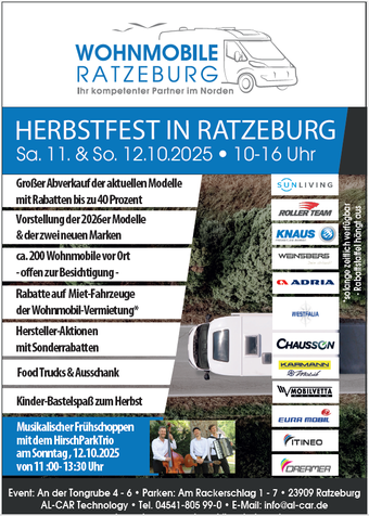 📍 Ratzeburg. Herbstzeit - nach der Camping-Saison ist vor der Camping-Saison. Wohnmobilisten sind ein umtriebiges Völkchen, und so wird die kühlere Jahreszeit entweder ebenfalls zur Camping-Saison erkoren – was sich dank moderner Isolierung und Heizungsanlagen immer angenehmer gestaltet - oder die nächste warme Reisezeit wird bereits verplant.